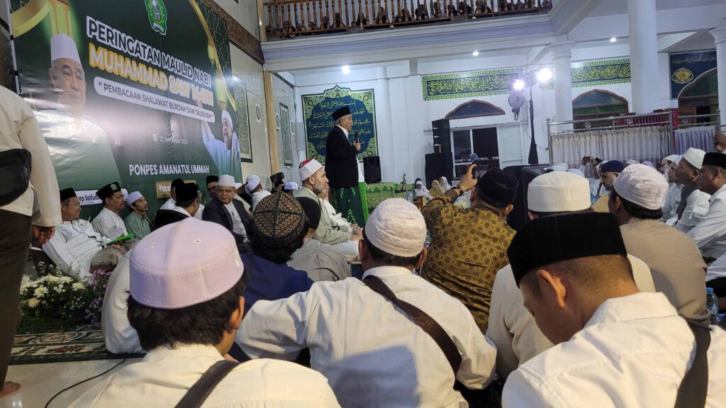 MOJOKERTO, Habib Ahmad bersama rombongannya dari Jakarta menyelenggarakan shalawat burdah di Pondok Pesantren Amanatul Ummah Pacet Mojokerto, Sabtu (20/9/2025) malam. Acara yang digelar di Masjid Raya KH Abdul Chalim itu dihadiri ribuan santri Amanatul Ummah dan masyarakat dari Mojokerto.